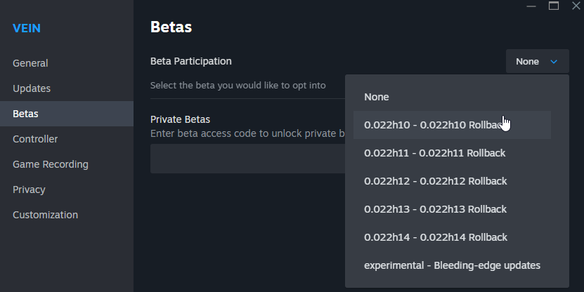 To access it, right click on VEIN in your Steam library, click Properties, navigate to the Betas tab, and select 0.022h10. Steam will then update the game back to 0.022h10.