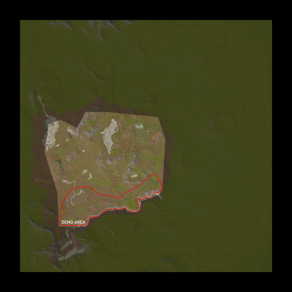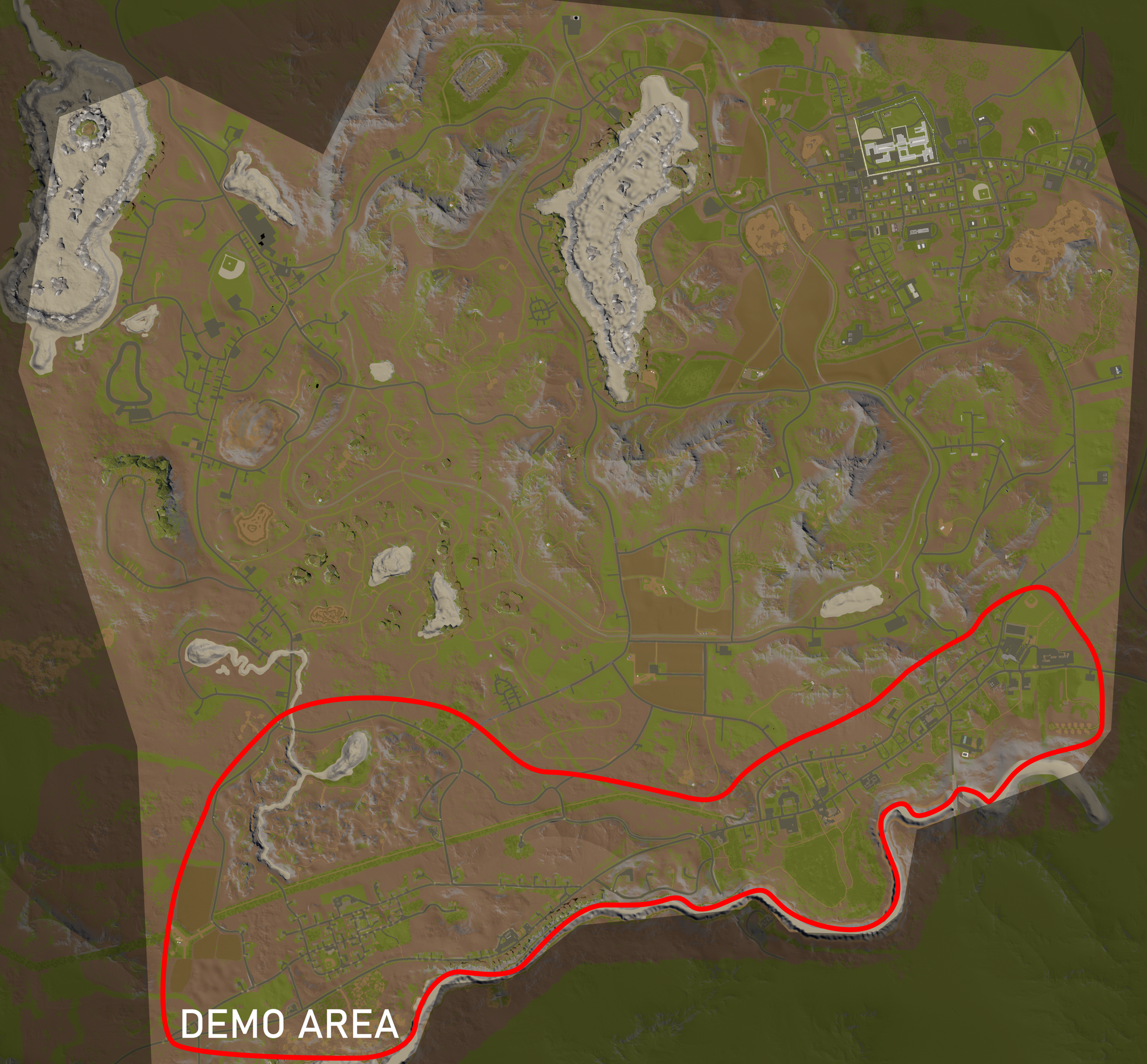 And finally, the map work for the initial Early Access map has been proceeding as normal. A few players have asked what the map size will look like compared to the current demo map. You've always been able to see this in the demo, but for the sake of accessibility here's a labeled screenshot of the current in-game map!